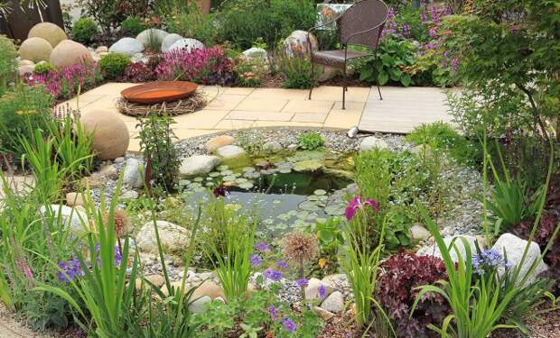 Водоем с каменистыми берегами и дном гармонично вписывается в дизайн участка любого стиля. А если вы не поленились соорудить бегущий по камням ручей или водопад, то для достижения максимального эффекта нужно лишь посадить подходящие растения.