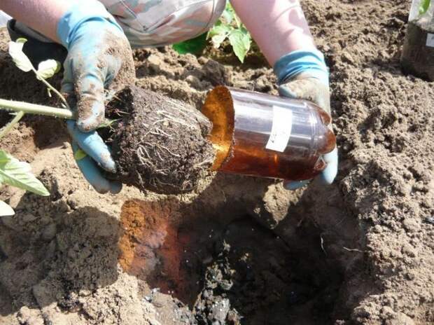 Лунки обильно заполняют водой и добавляют в них минеральные удобрения с перегноем в пропорции 1:3.